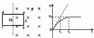 (16分)一有界匀强磁场区域如图甲所示,质量为m、电阻为R的长方形矩形线圈abcd边长分别为L和2L,线圈一半在磁场内,一半在磁场外,磁感应强度为B。,t。=0时刻磁场开始均匀减小,线圈中产生感应电流,在磁场力作用下运动,v-t图像如图乙,图中斜向虚线为过O点速度图线的切线,数据由图中给出,不考虑重力影响,求:(1)磁场磁感应强度的变化率.(2)t2时刻回路的电功率