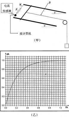 (15分)如图(甲)为一研究电磁感应的装置,其中电流传感器(相当于一只理想的电流表)能将各时刻的电流数据实时送到计算机,经计算机处理后在屏幕上显示出I-t图象。已知电阻R及杆的电阻r均为0.5Ω,杆的质量m及悬挂物的质量M均为0.1kg,杆长L=1m。实验时,先断开K,取下细线调节轨道倾角,使杆恰好能沿轨道匀速下滑。然后固定轨道,闭合K,在导轨区域加一垂直轨道平面向下的匀强磁场,让杆在物M的牵引下从图示位置由静止开始释放,此时计算机屏幕上显示出如图(乙)所示的 I-t图象(设杆在整个运动过程中与轨道垂直,且细线始终沿与轨道平行的方向拉杆,导轨的电阻忽略不计,细线与滑轮间的摩擦忽略不计,g=lOm/s2)。试求: