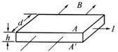 ★★★★9.如图所示,厚度为h、宽度为d的导体板放在垂直于它的磁感应强度为B的匀强磁场中,当电流通过导体板时,在导体板的上侧面A和下侧面A’之间会产生电势差,这种现象称为霍尔效应.实验表明,当磁场不太强时,电势差U、电流I和B的关系为U=kIB/d,式中的比例系数k称为霍尔系数.霍尔效应可解释如下外部磁场的作用使运动的电子聚集在导体板的一侧,在导体板的另一侧会出现多余的正电荷,从而形成横向电场,横向电场对电子施加与洛伦兹力方向相反的静电力,当静电力与洛伦兹力达到平衡时,导体板上下两侧之间就会形成稳定的电势差.设电流I是由电子的定向流动形成的,电子的平均定向移动速度为v,电量为e.回答下列问题: