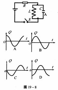 7.如图19-8所示,L为直流电阻可忽略不计的电感线圈,闭合S后,电路有稳定电流,若在t =0时,打开电键,则电容器C的A板上电量随时间t的变化图像是下图中的哪一个?( )