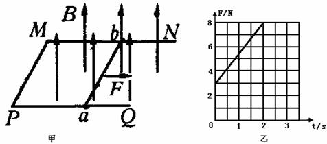(1)若保持磁感应强度B0的大小不变,从t=0时刻开始,给ab棒施加一个水平向右的拉力,使它做匀加速直线运动,此拉力F的大小随时间t的变化关系如图(乙)所示。