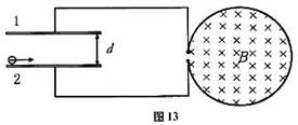 4.如图13所示,一半径为r的圆形导线框内有一匀强磁场,磁场方向垂直于导线框所在平面,导线框的左端通过导线接一对水平放置的平行金属板,两板间的距离为d,板长为l. t=0 时,磁场的磁感应强度B从B0开始均匀增大,同时,在板2的左端且非常靠近板2的位置有一质量为m、带电量为 –q 的液滴以初速度υ0水平向右射入两板间,该液滴可视为质点。