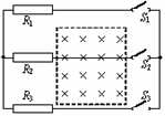 两金属棒和三根电阻丝如图连接,虚线框内存在均匀变化的匀强磁场,三根电阻丝的电阻大小之比R1:R2:R3=1:2:3,金属棒电阻不计。当S1、S2闭合,S3 断开时,闭合的回路中感应电流为I,当S2、S3闭合,S1 断开时,闭合的回路中感应电流为5I,当S1、S3闭合,S2 断开时,闭合的回路中感应电流是[ ]D