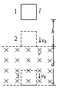 如图所示,水平的平行虚线间距为d=50cm,其间有B=1.0T的匀强磁场。一个正方形线圈边长为l=10cm,线圈质量m=100g,电阻为R=0.20Ω。开始时,线圈的下边缘到磁场上边缘的距离为h=80cm。将线圈由静止释放,其下边缘刚进入磁场和刚穿出磁场时的速度相等。取g=10m/s2,