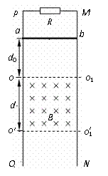 (本题12分)如图,竖直放置的光滑平行金属导轨MN、PQ相距L,在M点和P点间接一个阻值为R的电阻,在两导轨间 OO1O1′O′ 矩形区域内有垂直导轨平面向里、宽为d的匀强磁场,磁感应强度为B.一质量为m,电阻为r的导体棒ab垂直搁在导轨上,与磁场上边边界相距d0.现使ab棒由静止开始释放,棒ab在离开磁场前已经做匀速直线运动(棒ab与导轨始终保持良好的电接触且下落过程中始终保持水平,导轨电阻不计).求: