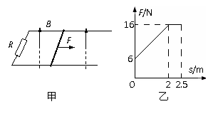 (14分)如图(甲)所示,一对平行光滑轨道放置在水平面上,两轨道相距L=1 m,两轨道之间用R=2Ω电阻连接,一质量为m=0.5 kg的导体杆与两轨道垂直,静止地放在轨道上,杆及轨道的电阻均忽略不计,整个装置处于磁感应强度B=2 T的匀强磁场中,磁场方向垂直轨道平面向上.现用水平拉力沿轨道方向拉导体杆,拉力F与导体杆运动的位移s间关系如图10(乙)所示,当拉力达到最大时,导体杆开始做匀速运动,经过位移s=2.5 m时,撤去拉力,导体杆又滑行了s′=2 m停下.求: