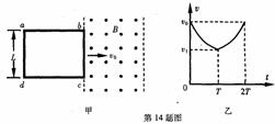 abcd的质量为m、电阻为R、ad边长度为L,其右侧是有左右边界的匀强磁场,磁场方向垂直纸面向外,磁感应强度大小为B,ab边长度与有界磁场区域宽度相等,在t=0时刻线圈以初速度v0进入磁场,在t=T时刻线圈刚好全部进入磁场且速度为vl,此时对线圈施加一沿运动方向的变力F,使线圈在t=2T时刻线圈全部离开该磁场区,若上述过程中线圈的v-t图象如图乙所示,整个图象关于t=T轴对称.