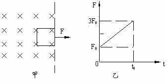 (10分)如图甲所示,一正方形金属线框位于有界匀强磁场区域内,线框的右边紧贴着边界。t=0时刻对线框施加一水平向右的外力F,让线框从静止开始做匀加速直线运动,经过时间t0穿出磁场,图乙为外力F随时间t变化的图象。若线框质量m,电阻R及图象中F0、t0均为已知量,则根据上述条件,请你推出: