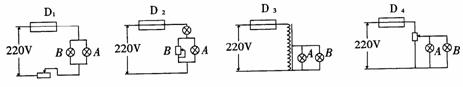 9.如图所示,把标有"110V,60V"和"110V,40V"的A、B两个灯泡按下面四种情况 接入220V的照明电路,且都调到正常发光时,选用的保险丝从粗到细,顺序是( )