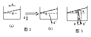 例2 如图2(a),一容器内盛有水,当容器向左以加速度a运动时,水面会出现倾斜,试求水面倾角的大小。