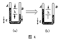 例3 如图4(a),两端封闭的U形管内装有一部分水银,U形管静止时,两管水银面高度差为h。当v形管以加速度a=g/2向下运动时,两端水银面高度差将如何变化?