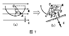 例6 如图7(a),一光滑绝缘半球面放在匀强电场中,场强为E,方向水平向右。现将一正电荷q放在A点时恰能平衡,A点和球心O的连线与竖直线的夹角为30°,则