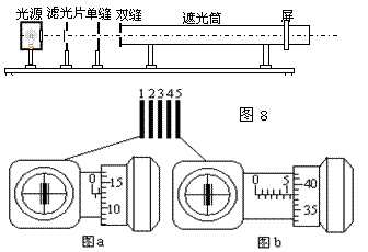 某同学在《用双缝干涉测光的波长》的实验中,实验装置如图8所示。使用的双缝的间距为0.025cm。实验时,首先调节________和__________的中心位于遮光筒的中心轴线上,并使_________和________竖直且互相平行。当屏上出现了干涉图样后,通过测量头(与螺旋测微器原理相似,手轮转动一周,分划板前进或后退0.500mm)观察第一条亮纹的位置如图(a)所示,第五条亮纹位置如图(b)所示,测出双缝与屏的距离为50.00cm,则待测光的波长λ=___________nm。