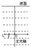 20、如图7所示,在折射率为5/3的某种液体中,水平放置一会聚薄透镜L,它在这种液体中的焦距为7cm,透镜其余部分已被完全涂黑而不能透光,仅在距光心6cm的P点留有一小孔,可让光线穿过 。求应将点光源放在透镜下方主轴上的哪个范围内,才能使穿过小孔P的光线通过液面折射入上方的空气中(保留3位有效数据)