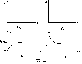 [小结] 发动机的输出功率P恒定时,据P = F·V可知v变化,F就会发生变化。牵动ΣF,a变化。应对上述物理量随时间变化的规律有个定性的认识。下面通过图象给出定性规律。(见图3-4所示)