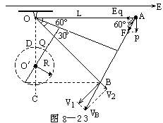 开始时,摆球在合力F的作用下沿力的方向作匀加速直线运动,从A点运动到B点,由图8-23可知,△AOB为等边三角形,则摆球从A到B,在等效力场中,由能量守恒定律得: