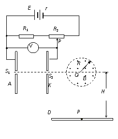 cm的圆形区域内,有一个水平方向的匀强磁场,磁感应强度大小为B=0.10T,方向垂直纸面向外。竖直平行放置的两金属板A、K连在如图所示的电路中。电源电动势E=91V,内阻r=1.0Ω,定值电阻R1=10Ω,滑动变阻器R2的最大阻值为80Ω,S1、S2为A、K板上的两个小孔,且S1、S2跟O在竖直极板的同一直线上,另有一水平放置的足够长的荧光屏D,O点跟荧光屏D之间的距离为H=3R。比