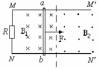 之间接有电阻R,导轨左、右两区域分别处在方向相反与轨道垂直的匀强磁场中,方向见图,设左、右区域磁场的磁感强度为B1和B2,虚线为两区域的分界线。一根金属棒ab放在导轨上并与其正交,棒和导轨的电阻均不计。金属棒在水平向右的恒定拉力作用下,在左面区域中恰好以速度为υ做匀速直线运动,则: ( )