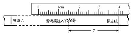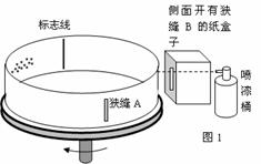 一个喷漆桶能够向外喷射不同速度的油漆雾滴,某同学决定测量雾滴的喷射速度,他采用如图1所示的装置,一个直径为d=40cm的纸带环, 安放在一个可以按照不同转速转动的固定转台上,纸带环上刻有一条狭缝A,在狭缝A的正对面画一条标志线,如图1所示。在转台开始转动达到稳定转速时,向侧面同样开有狭缝B的纸盒中喷射油漆雾滴,当狭缝A转至与狭缝B正对平行时,雾滴便通过狭缝A在纸带的内侧面留下痕迹。将纸带从转台上取下来,展开平放,并与毫米刻度尺对齐,如图所示。