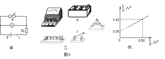 的关系图线(该图线为一直线),如图8丙所示。由图线可求得电池组的电动势E = V,内阻r= Ω。(保留两位有效数字)