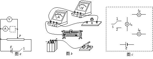 ⑶现有如下器材:电源E(6V,内阻不计),灯泡L1(6V,1.5W)、L2(6V,10W),L3(6V,10W),单刀双掷开关S。在图(c)中设计一个机动车转向灯的控制电路:当单刀双掷开关S与1相接时,信号灯L1亮,右转向灯L2亮而左转向灯L3不亮;当单刀双掷开关S与2相接时,信号灯L1亮,左转向灯L3亮而右转向灯L2不亮。