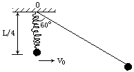 22、如图所示,长为L的轻绳一端系于固定点O,另一端系一质量为m的小球,将小球从O点正下方L/4处,以水平初速度向右抛出,经一定时间绳被拉直,以后小球将以O为支点在竖直平面内摆动。已知绳刚被拉直时,绳与竖直方向成60°角。求:(1)小球水平抛出的初速度v0;(2)在绳被拉紧的瞬间,支点O受到的冲量。