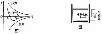 (2)如图10所示,带有活塞的气缸中封闭一定质量的气体(不考虑分子势能)。将一个热敏电阻(电阻值随温度升高而减小)置于气缸中,热敏电阻与气缸外的欧姆表连接,气缸和活塞均具有良好的绝热性能。若发现欧姆表读数变大,则气缸内气体压强一定____________,若发现欧姆表读数变小,则气缸内气体内能一定______________。
