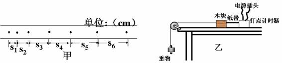 (改编)例3.在探究加速度与物体质量、物体受力的关系实验中,实验装置如图乙所示:一木块放在水平光滑长木板上,左侧拴有一不可伸长的细软线,跨过固定在木板边缘的滑轮与一重物相连,重物的质量为m .木块右侧与穿过打点计时器的纸带相连,在重物牵引下,木块在木板上向左做匀加速运动.图甲给出了打点计时器在纸带上打出的一些连续的点,它们之间的距离分别为S1、S2 、S3、S4、S5、S6,打点计时器所用交流电周期为T0. 根据给以上数据求: