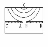 如图所示,是观察水面波衍射的实验装置,AC和BD是两块挡板,AB是一个小孔,O点是波源。图中已画出波源所在区域波的传播情况,每两条相邻波纹(图中曲线)之间表示一个波长,则波经过孔之后的传播情况,下列描述正确的是: ( )