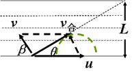 ②当v<u时,划船的速度方向与河岸夹β角偏向上游方向,于是又有
