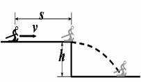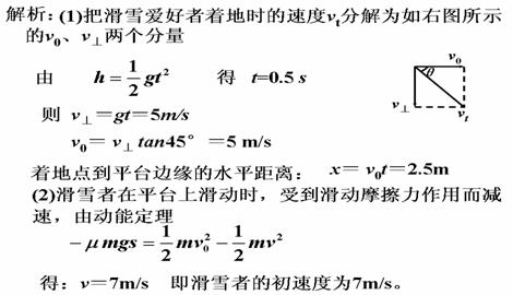 例2.在冬天,高为h=1.25m的平台上,覆盖一层薄冰,一乘雪橇的滑雪爱好者,从距平台边缘s=24m处以一定的初速度向平台边缘滑去,如图所示,当他滑离平台即将着地时的瞬间,其速度方向与水平地面的夹角为θ=45°,取重力加速度g=10 m/s2。求: