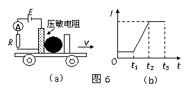 压敏电阻的阻值随所受压力的增大而减小,右位同学利用压敏电阻设计了判断小车运动状态的装置,其工作原理如图6(a)所示,将压敏电阻和一块挡板固定在绝缘小车上,中间放置一个绝缘重球。小车向右做直线运动过程中,电流表示数如图6(b)所示,下列判断正确的是( )