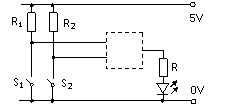 车门报警装置逻辑电路图,图中的两个按钮开关分别装在汽车的两扇门上.只要打开任意一扇门,即电路中任何一个开关处于断开状态,发光二极管就发光报警.请你根据报警装置的要求,在电路图的虚线框内画出