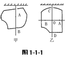 ⑶重心的确定方法--悬挂法。薄板形物体的重心,可用悬挂法确定(如图1-1-1甲、乙所示),先在A点把板悬挂起来,物体静止时,物体所受的重力与悬绳的拉力在同一竖直线上,所以物体的重心一定在通过A点的竖直线AB上,然后在C点把物体悬挂起来,同理知,物体的重心一定在通过CD的竖直线上,则重心的位置一定是AB、CD的交点。