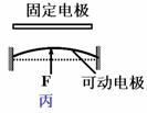 解析:压力F,由于C∝1/d,压力F 作用在可动电极上,引起极板间距d 的变化,通过测出C的变化,测量压力F的变化。