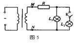 5.如图5所示,理想变压器的副线圈上通过输电线接有两个相同的灯泡L1和L2;输电线的等效电阻为R,开始时,电键K断开,当K断通时,以下说法正确的是 ( )