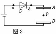 示,D是一只二极管,它的作用是只允许电流从a流向b,不允许电流从b流向a ,平行板电容器AB内部原有电荷P处于静止状态,当两极板A和B的间距稍增大一些的瞬间(两极板仍平行),P的运动情况将是( )
