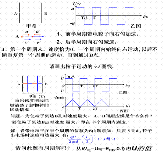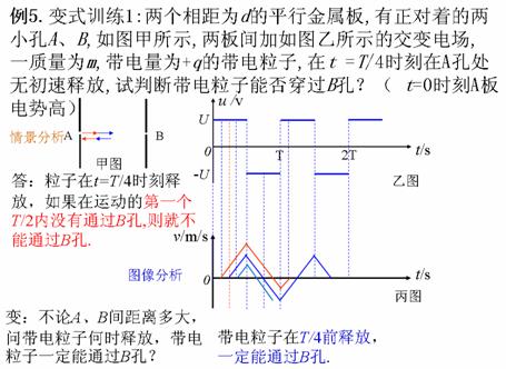 例4:两个相距为d 的平行金属板,有正对着的两小孔A、B,如图甲所示,两板间加如图乙所示的交变电场, 一质量为m,带电量为+q 的带电粒子,