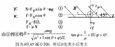 (原创)例4.如图所示,一水平导轨处于与水平方向成45°角向左上方的匀强磁场中,一根通有恒定电流的金属棒,由于受到安培力作用而在粗糙的导轨上向右做匀速运动。现将磁场方向沿顺时针缓慢转动至竖直向上,在此过程中,金属棒始终保持匀速运动,已知棒与导轨间动摩擦因数μ<1,则磁感应强度B的大小变化情况是(