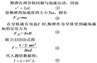 例5.据报道,最近已研制出一种可投入使用的电磁轨道炮,其原理如图所示。炮弹(可视为长方形导体)置于两固定的平行导轨之间,并与轨道壁密接。开始时炮弹在导轨的一端,通以电流后炮弹会被磁力加速,最后从位于导轨另一端的出口高速射出。设两导轨之间的距离w=0.10m,导轨长L=5.0m,炮弹质量m=0.30kg。导轨上的电流I的方向如图中箭头所示。可以认为,炮弹在轨道内运动时,它所在处磁场的磁感应强度始终为B=2.0T,方向垂直于纸面向里。若炮弹出口速度为v=2.0×103m/s,求通过导轨的电流I。忽略摩擦力与重力的影响。