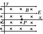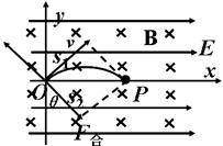 例2. 07南京检测15如图所示,坐标系xOy位于竖直平面内,在该区域内有场强E=12N/C、方向沿x轴正方向的匀强电场和磁感应强度大小为B=2T、沿水平方向且垂直于xOy平面指向纸里的匀强磁场.一个质量m=4×10-5kg,电量q=2.5×10-5C带正电的微粒,在xOy平面内做匀速直线运动,运动到原点O时,撤去磁场,经一段时间后,带电微粒运动到了x轴上的P点.取g=10 m/s2,求: