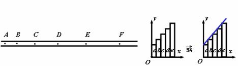 例5.在“利用打点计时器测定匀加速直线运动加速度”的实验中,某同学在打出的纸带上每5点取一个计数点,共取了A、B、C、D、E、F六个计数点(每相邻两个计数点间的四个点未画出)。从每一个计数点处将纸带剪开分成五段(分别叫a、b、c、d、e段),将这五段纸带由短到长紧靠但不重叠地粘在xoy坐标系中,如图所示,由此可以得到一条表示v-t关系的图线,从而可求出加速度。