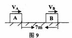 如图9,A、B物体相距S=7m时,A在水平拉力和摩擦力作用下,正以VA=4m/s的速度向右匀速运动,而物体B此时正以VB=10m/s向右匀减速运动,加速度a=-2m/s2,则A追上B所经历时间是( )