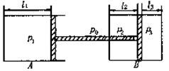 18.(16分)如图所示,圆柱形气缸A、B的直径相同,B是封闭的,气缸内各部分理想气体的压强为p1=0.5×105Pa,p2=1.5×105Pa,外界大气压p0=1.0×105Pa,初温均为27℃,l1=30cm,l2=16cm,l3=8cm。A、B内两活塞用硬细杆相连处于静止状态,忽略一切摩擦,欲使B内两部分气体压强相等,须使A的温度升高多少?(表示B内温度不变)
