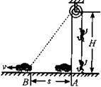 摄制组在某大楼边拍摄武打片,要求特技演员从地面飞到屋顶,如图所示,若特技演员的质量m=50kg(人和车可视为质点),g取10m/s2,导演在某房顶离地H=8m处架设了轮轴,轮和轴的直径之比为2:1.若轨道车从图中A前进s=6m到B处时速度为v=5m/s,则由于绕在轮上细钢丝拉动,特技演员 ( )