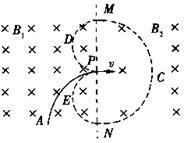 不带电.如图所示,两匀强磁场方向相同,以虚线MN为理想边界,磁感应强度分别为B1、B2.今有一个K-介子沿垂直于磁场的方向从A点射入匀强磁场B1中,其轨迹为圆弧AP,P在MN上,K-介子在P点时速度为v,方向与MN垂直.在P点该介子发生了上述衰变,衰变后产生的