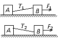 7.如图所示,A、B两木块放在水平面上,它们之间用细线相连,两次连接情况中细线倾斜方向不同但倾角一样,两木块与水平面间的摩擦系数相同,先后用水平力F1和F2拉着A、B一起匀速运动,则 ( )