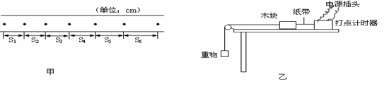②(10分)在探究加速度与物体质量、物体受力的关系实验中,实验装置如图乙所示:一木块放在水平光滑长木板上,左侧拴有一不可伸长的细软线,跨过固定在木板边缘的滑轮与一重物相连,重物的质量为m .木块右侧与穿过打点计时器的纸带相连,在重物牵引下,木块在木板上向左做匀加速运动.图甲给出了打点计时器在纸带上打出的一些连续的点,它们之间的距离分别为S1、S2、S3、S4、S5、S6,打点计时器所用交流电周期为T. 根据给以上数据求: