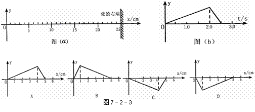 轴方向)的扰动,其位移随时间的变化规律如图(b)所示。该扰动将沿弦线传播而形成波(孤立的脉冲波)。己知该波在弦线中的传播速度为2cm/s,下图中表示自o点沿弦向右传播的波在t=2.5s时的波形图7–2–3