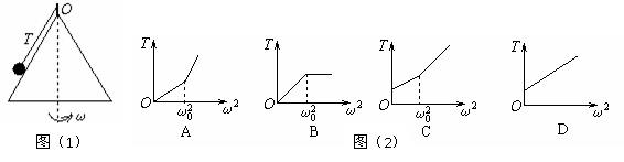 用一根细线一端系一小球(可视为质点),另一端固定在一光滑锥顶上,如图(1)所示,设小球在水平面内作匀速圆周运动的角速度为ω,线的张力为T,则T随ω2变化的图象是图(2)中的 ( )